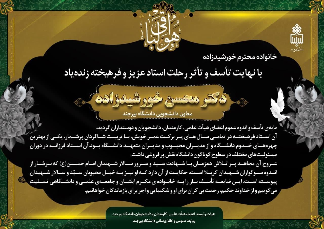 تسلیت درگذشت استاد فرزانه زندهیاد دکتر محسن خورشیدزاده، معاون دانشجویی دانشگاه بیرجند ۰۲ شهریور ۱۴۰۰ | ۰۸:۵۶ کد : ۱۴۰۷۵ اخبار برگزیده اخبار دانشکدهها اطلاعیه های مهم اخبار ستادی اخبار دانشجویان اخبار کارکنان اخبار اساتید ارسال به دیگران نام شما ایمیل شما ایمیل دریافتکننده ارسال انصراف تعداد بازدید:۹۱۰۶ با نهایت تأسف و تأثر رحلت استاد عزیز و فرهیخته زندهیاد دکتر محسن خورشیدزاده، معاون دانشجویی دانشگاه بیرجند مایهی تأسف و اندوه عموم اعضای هیأت علمی، کارمندان، دانشجویان و دوستداران گردید.
