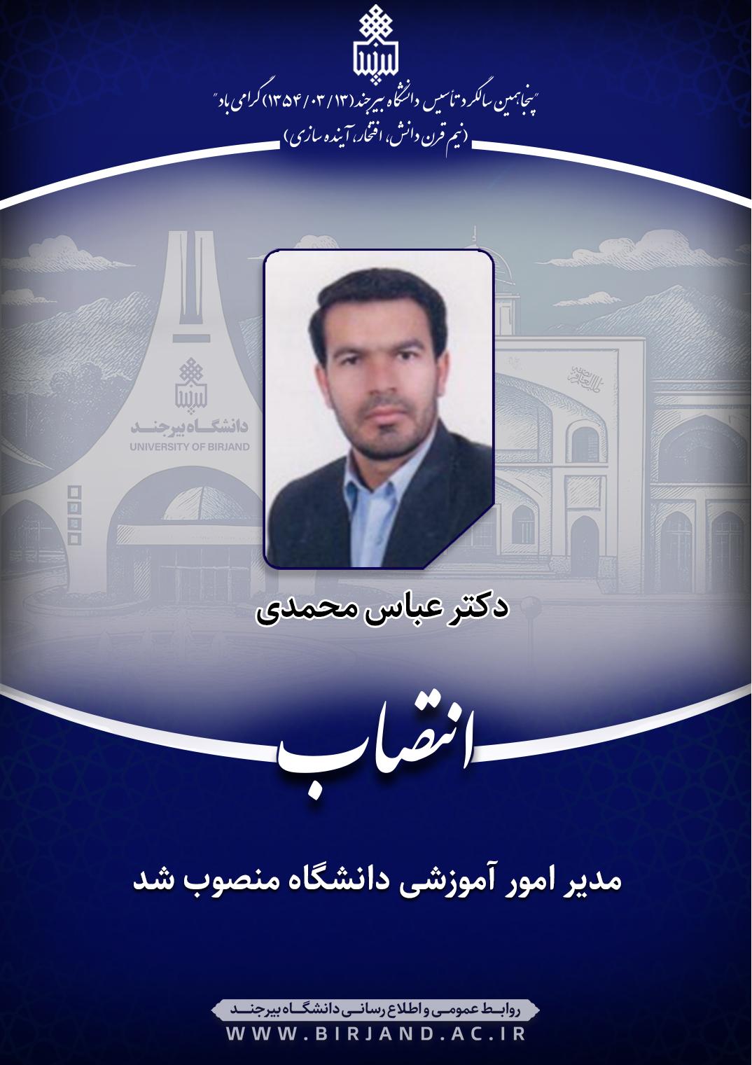 با صدور ابلاغی از سوی دکتر احمد خامسان، سرپرست دانشگاه بیرجند، دکتر عباس محمدی، عضو هیأت علمی گروه آموزشی گیاه‌پزشکی، به مدت دو سال به عنوان مدیر امور آموزشی دانشگاه بیرجند منصوب شد.