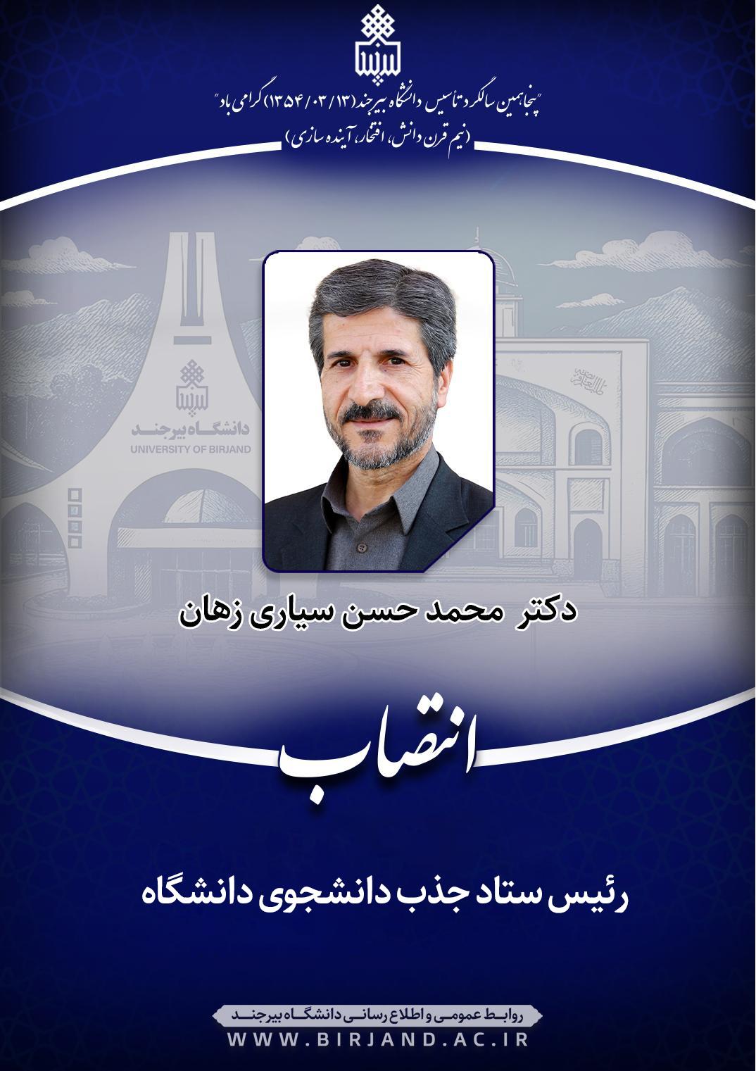 براساس ابلاغی، دکتر احمد خامسان، سرپرست دانشگاه بیرجند، دکتر محمدحسن سیاری، معاون آموزشی و تحصیلات تکمیلی  را به عنوان رئیس ستاد جذب دانشجوی دانشگاه به مدت دو سال منصوب کرد.